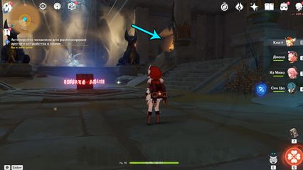 Чтобы сделать факелы видимыми, нам нужна клетка истины. А она находится на голубой платформе, к которой нужно поднести камень. А сам камень находится под песком в углу, и чтобы убрать песок, используйте на нем Анемо умение.