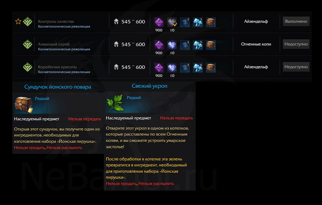 Чтобы получить каждый из ингредиентов вам нужно делать еженедневный квест Эфонского союза «Контроль качества». Как сделаете его 3 раза, вам станет доступно задание «Алмазный скраб», за него тоже дают сундук. Следующий после него квест – «Коробочки красоты», они тоже с сундуком.