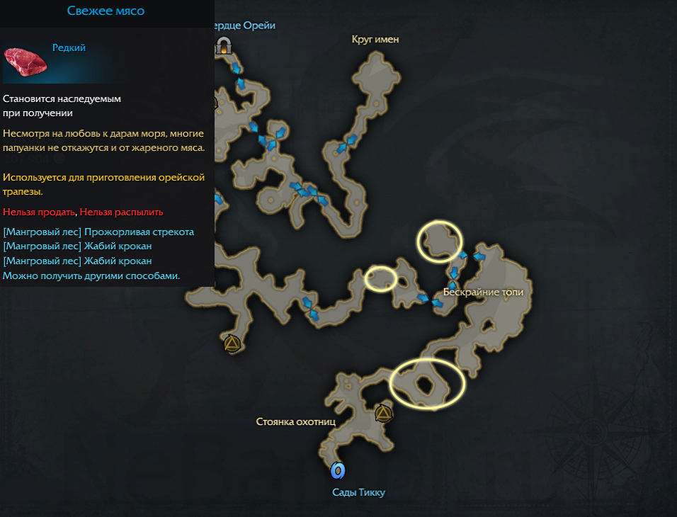 Для крафта Орейской трапезы нужно выбить 500 свежего мяса, 1000 душистых трав (Берег Рассвета), 500 кислого цветочного вина (Отмель живых огней), 700 сочного манго (Сады Тикку).